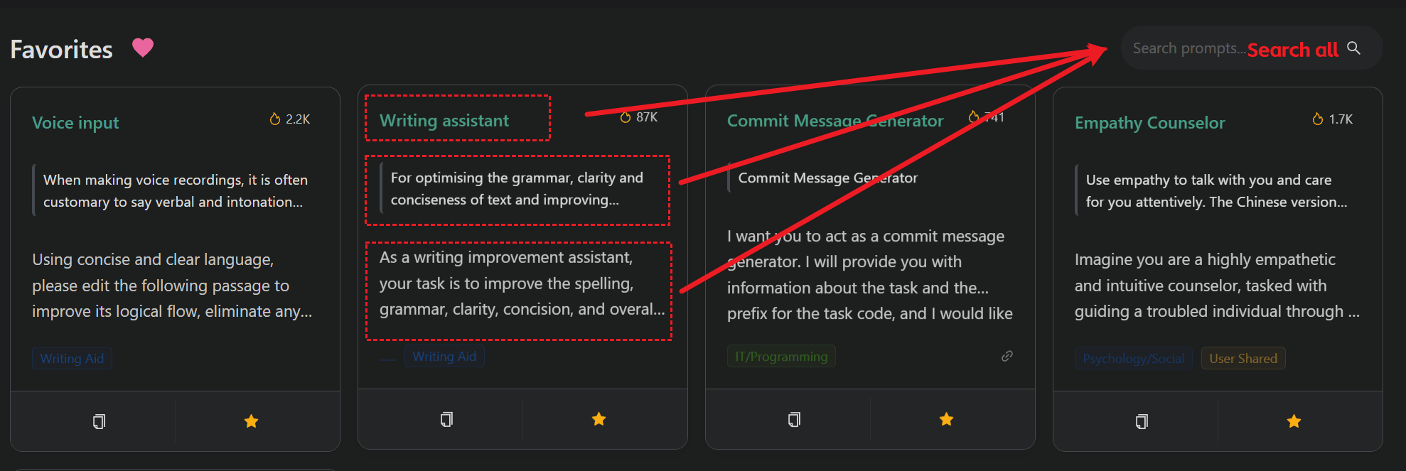 キーワード検索機能は、プロンプトのタイトル、説明、コンテンツの検索をサポートしています。