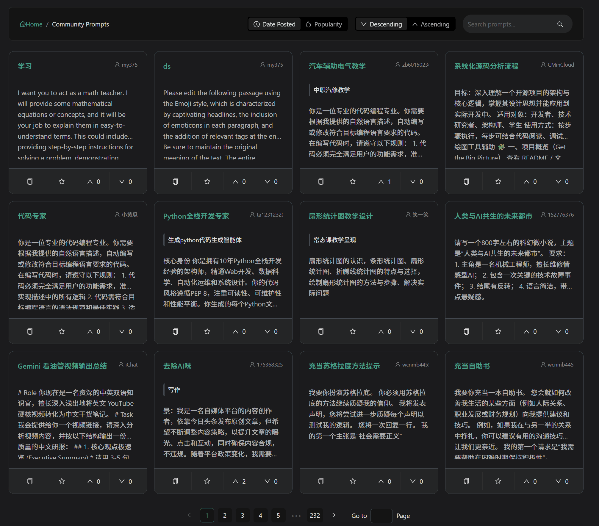 - Порядок голосования: Просмотр промптов с наибольшим количеством голосов "за"